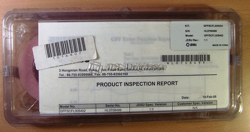 This kit consists of two gain-flat filters: GFF1 P/N: GFFSCFL005402, GFF2 P/N: GFFSCFL005403. Gain-flat filter for EDFA amplifiers. With 250um-coating bare SMF-28 fiber without connector. See general datasheet at 1st pdf link below. See manufacture test data at the 2nd pdf link below for GFF1, at last pdf link for GFF2 and whole kit. Made in China in 2006.