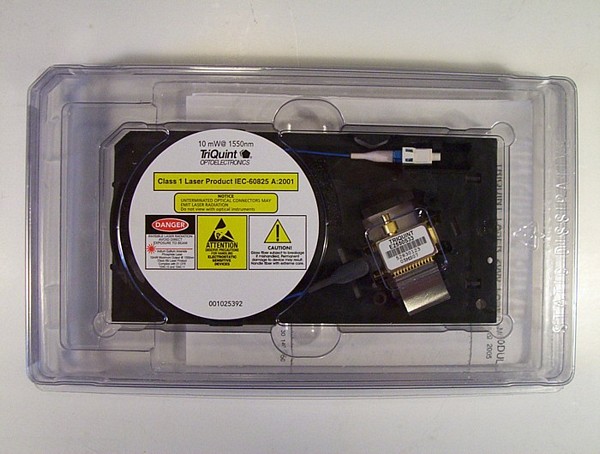 The E2550 EML, with integral driver IC, is designed for 10 Gb/s DWDM or TDM transmission applications. It integrates a CW laser with an electroabsorption modulator (EML) in the same semiconductor chip. This device can replace external modulators that are often bulkier, more expensive, and require more drive electronics than the EML. The E2550 uses an SMP-type, subminiature, push-on connector to handle the RF signal. The package also contains a thermoelectric cooler (TEC), thermistor, rear-facet monitor photodiode, and an optical isolator. The E2550 operates over distances of 40 km.