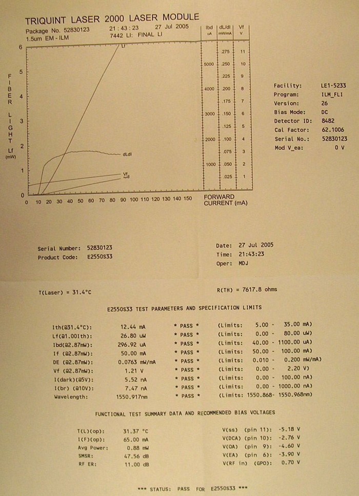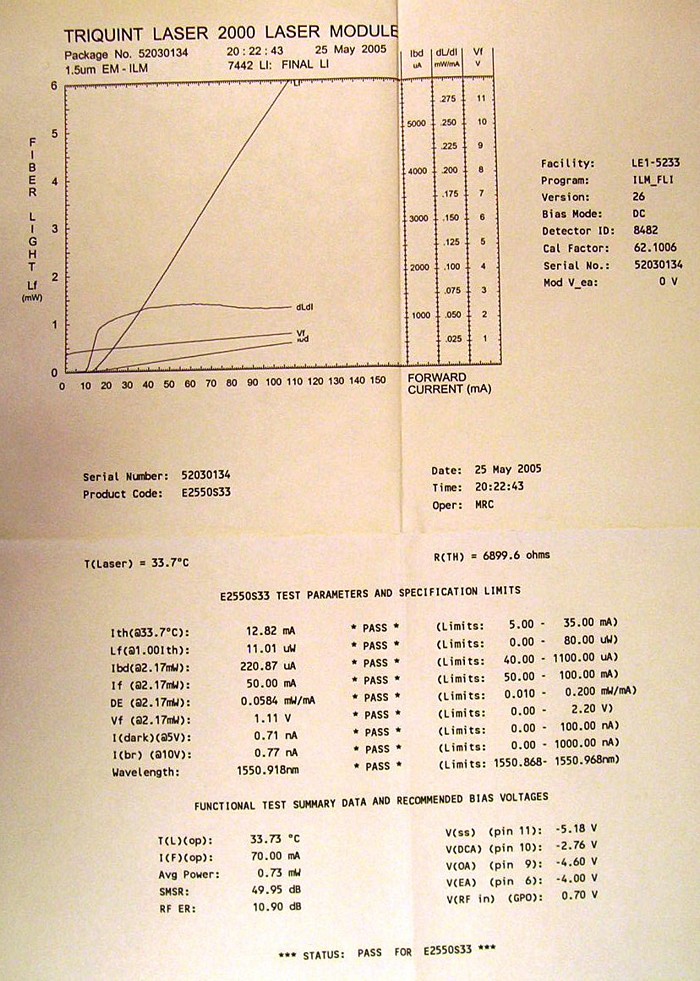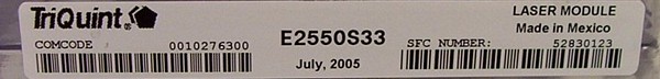 The nominal input impedance of the E2550 is 50 OHM. The package is qualified to the Telcordia Technologies. TA-TSY-000468 standard. The E2550 is available in the full range of C-band ITU-T wavelengths for use in DWDM systems operating at 10 Gb/s per channel. The device exhibits excel- lent wavelength stability, supporting operation at 100 GHz channel spacing over 20 years (assuming an end-of-life aging condition of less than ±100 pm). Typically, external wavelength stabilization is not required in systems of this type, using TriQuint's EML products. The package also offers excellent stability of wavelength vs. case temperature, with a maximum coefficient of ±0.5 pm/°C.