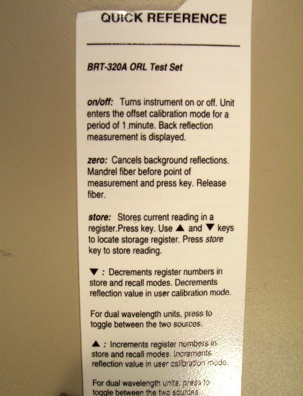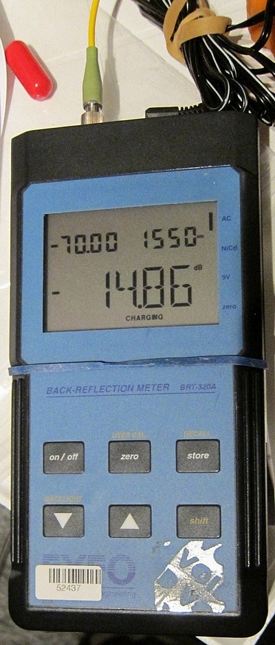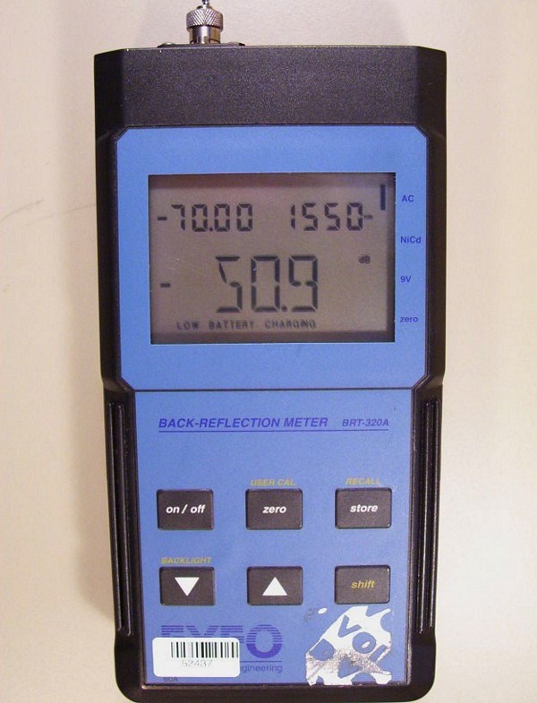 OPTICAL RETURN LOSS TEST SET,  1550 +/-15 nm.  Reflection rabge: 0 to -70 dB. Output>-6.5dBm.  With FC/APC fiber adapter, and internal fiber connector looks quite clean under fiber scope for female connector. Built-in Ni-Cd rechargeble battery. AC power adapter/charger is missing. We will include one 9 V alkaline battery backup. For long term use, you may use your own 9V Ni-MH rechargeable battery.