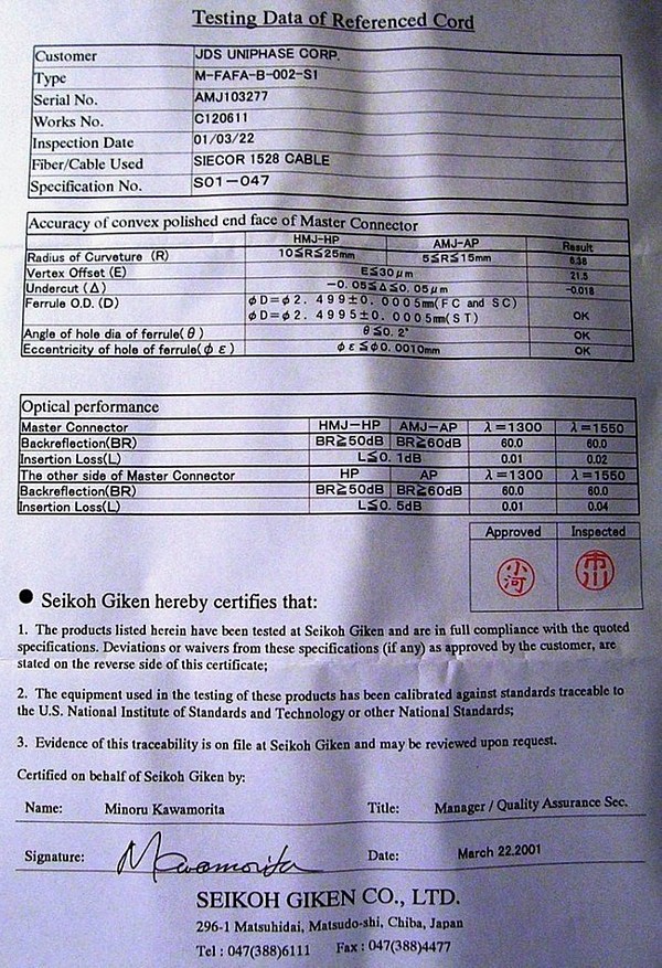 With 3mm Siecor cable, 2-meter. It is made by Seikoh Giken Co, Ltd., and supplied for JDS. It is 9/125um standard SM fiber, based on the product label information of P/N: M-SPFA-B-002-S1 (only connector types and length are different).Master fiber jumper as reference cord, so it offers better performance in insertion loss and return loss.