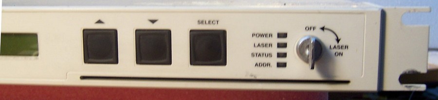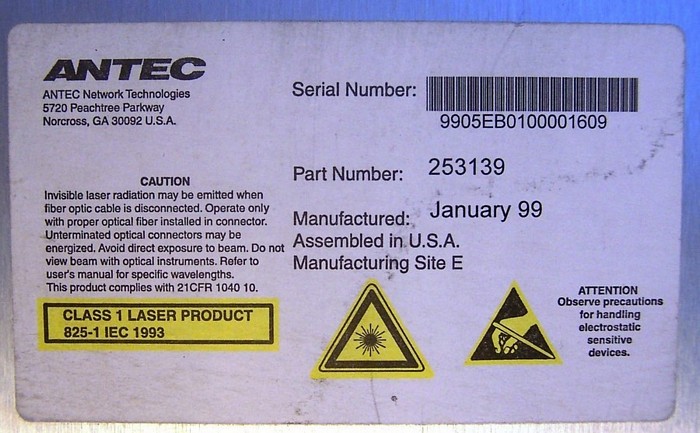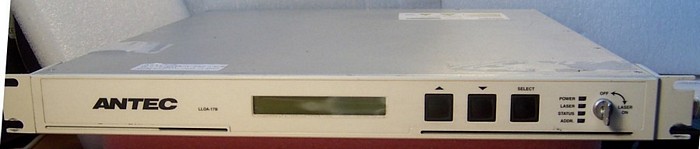 Antec 17dBm EDFA instrument over C-band, in 19-inch 1U rack. Minimum input power: -10dBm. From front panel, user can adjust output power by changing attenuation at optical output(see 11th photo), adjust allowed minimum input power (For example, P in Trigger Level: Pump on -10dBm, see 12th photo). Antec sold to Scientific Atlanta, then sold to Cisco. See very-similar-model specification at the 1st pdf link below, and more info at 2nd pdf link below. In our lab test, on EDFA front panel: Set Atten=0dB, allowed minimum input power -10dBm. See our lab test result of gain, noise figure, and output power at -8dBm, -2dBm, and 4dBm input power at last pdf link below (noise figure result is not so accurate at high signal input). Output power 17dBm or even 18dBm is verified at 4dBm and -2dBm input over C-band. Gain is quite flat over C-band at -2dBm and 4dBm inputs, and gain flatness is not too bad at -8dBm input. Datecode: Jan. 1999. Last 12 photos below only showing LCD are from similar model LLOA-17A, but the features of these two models are same.