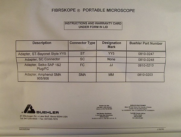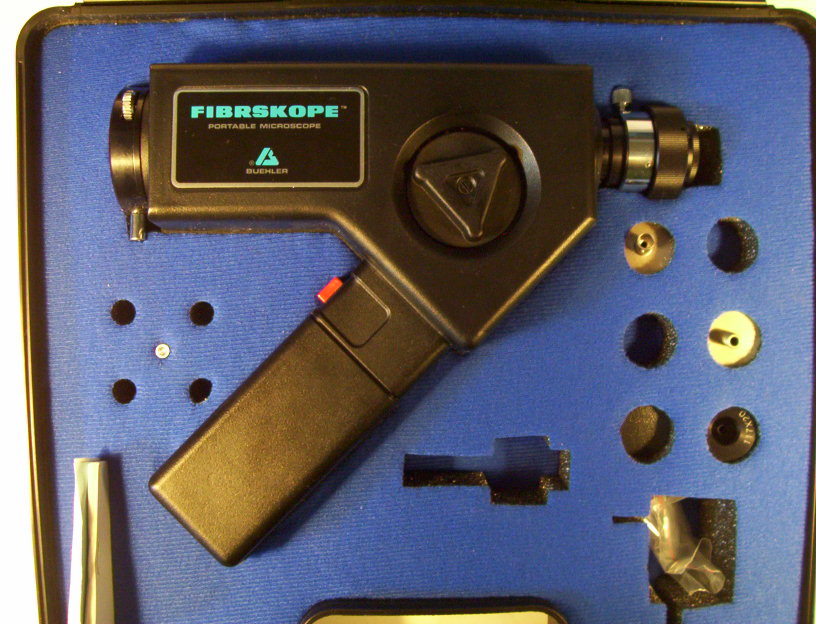 FIBRSSKOPE portable microscope, high resolution, with carrying case. With FC, ST, SMA, universal adapter. BUEHLER P/N: 0801-9505