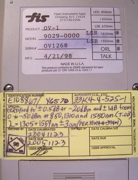 FIS Optical Verifier OV-1. Return loss & insertion loss test set. With 1.3/1.55um lasers and 850/1310/1550nm power meter. PN:9029-0000.