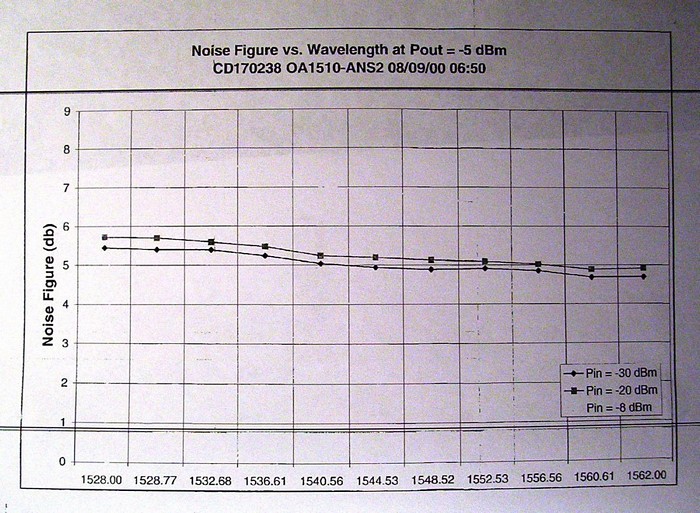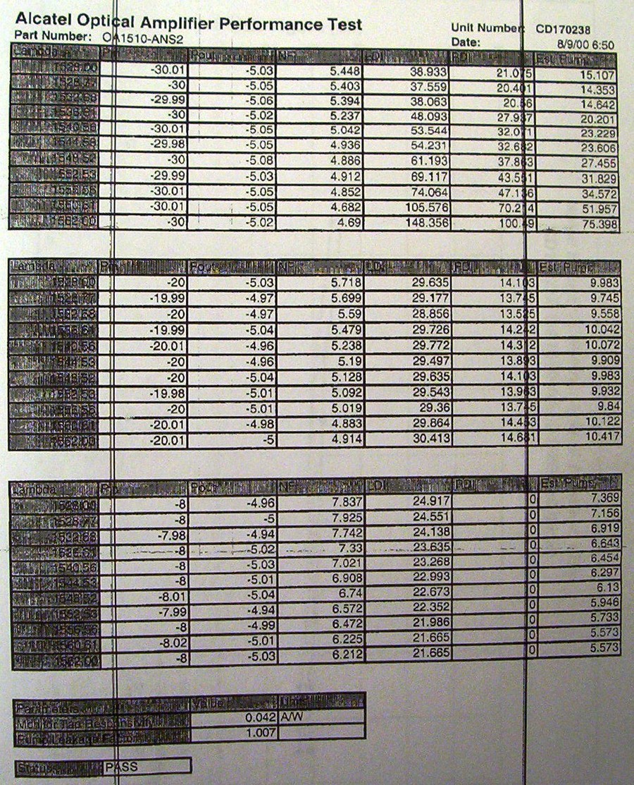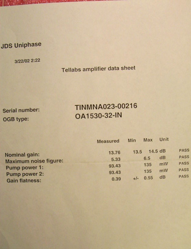 We believe it is used as booster amplifier, based on part number "OUTH". It includes erbium-doped fiber, three JDS isolators (IS3550), WDM couplers, JDS VCB-Z001D electrical-controlled optical attenuator module, two photodiodes, tap couplers, three passive gain-flat filter devices(RF1558-TL-NJ1, RF1546-TL-NJ1, RF1533-TL-NJ1). Two external pump lasers are required. Sorry we do not know the pinout, so you may have to use this module as parts. Made for Tellabs.We opened the sealed module case, only to see what is inside.The test sheet in last three photos below are from similar models OA1510-ANS2 and OA1530-32-IN, only for reference.
