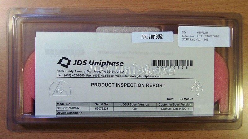 Gain-flat filter for EDFA amplifiers. Minimum insertion loss < 0.8dB (wavelength independent loss). Error function < 0.7dB. With 250um-coating bare SMF-28 fiber without connector. See general datasheet at 1st pdf link below. See manufacture test data from our samples at last pdf link below. Made in USA in 2002.