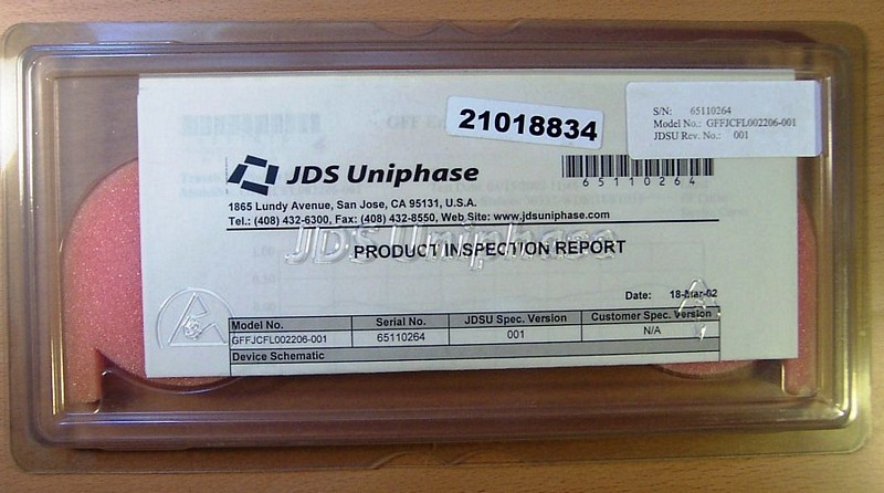 Gain-flat filter for EDFA amplifiers. Minimum insertion loss < 0.8dB (wavelength independent loss). Error function < 0.65dB. With 250um-coating bare SMF-28 fiber without connector. See general datasheet at 1st pdf link below. See manufacture test data from our samples at last pdf link below. Made in USA in 2002.