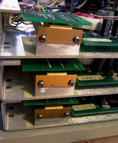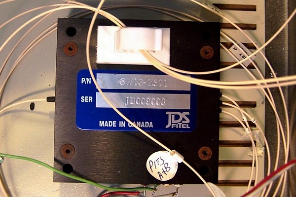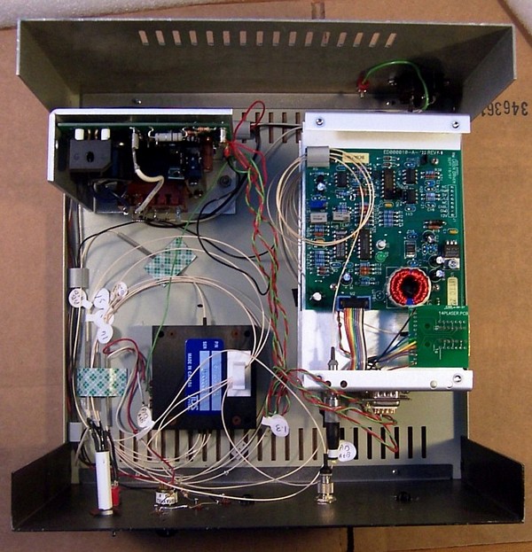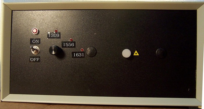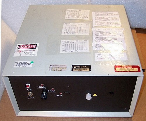 You can select wavelength among 1309nm, 1556nm, and 1631nm at the front panel of the instrument. Laser modules are in 14-pin butterfly with TEC (see 8th photo below). There are one 1x3 optical switch (JDS P/N: SW13-Z321) inside the instrument to select laser source module. The lasers are driven by a regulated linear power supply (GHOF 1-5 Rev.A, output 5V 3.0A).