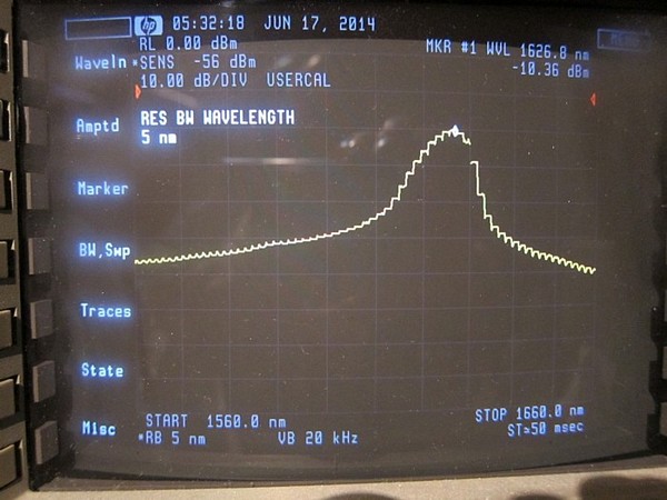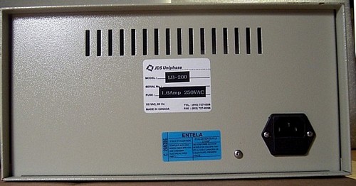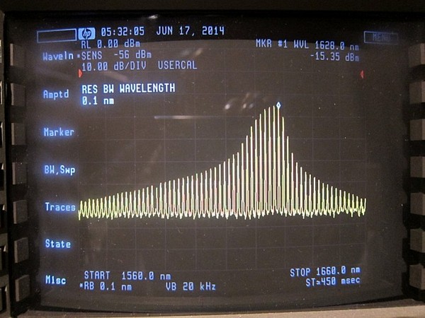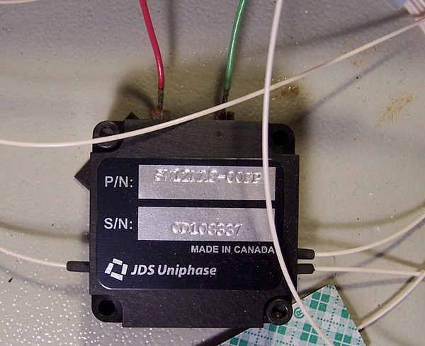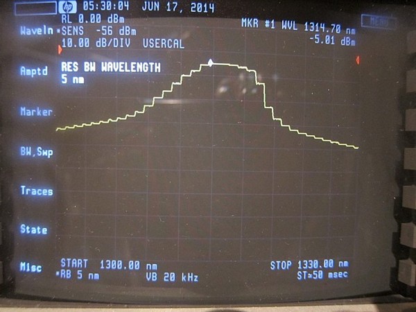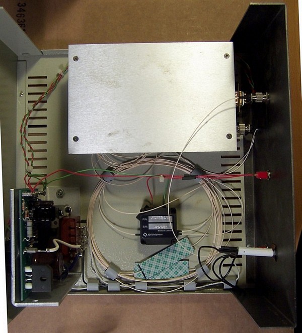 You can select wavelength between 1315.26m and 1624.9nm at the front panel of the instrument. Laser modules are in 14-pin butterfly with TEC (see 8th photo below). There are one 1x2 optical switch (JDS P/N: SW12NA8-00FP) inside the instrument to select laser source module. The lasers are driven by a regulated linear power supply (GHOF 1-5 Rev.A, output 5V 3.0A). FC/PC adapter at output port. Internal SM fiber connector looks clean under fiber scope for female connector. We tested output power after warmup (see 3rd photo below) and optical spectrum (see last 6 photos below. Center wavelength data is from OSA test with RBW=5nm). Optical output power is very stable. Tested laser output power and center wavelength : -4.702dBm 1314.74nm at 1315.26nm port. -7.730dBm 1626.8nm at 1624.9nm port. Original tested optical spectrum result by JDS was labeled on 3rd photo below. AC input: 110V/120V is standard option. Upon your request, we can change to other AC input voltage option by re-wiring inside instrument. A power cord will be attached. Net weight: 4.4kg. Dimension: 30x28x14 cm