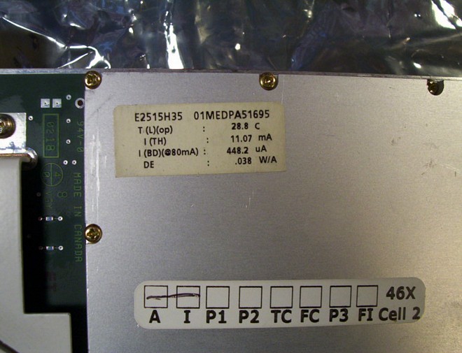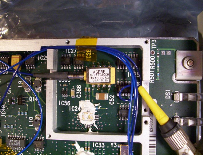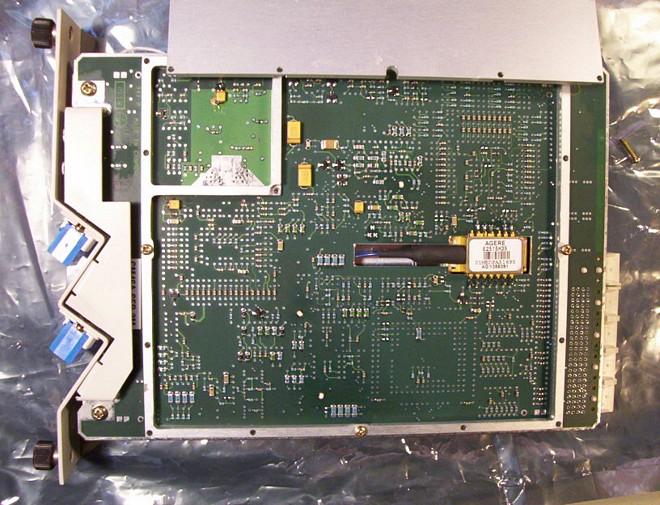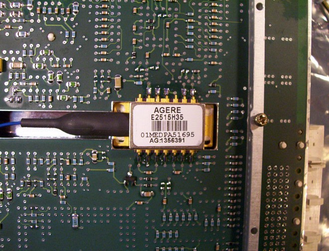 It inlcudes 2.5Gb laser module with integrated EA modulator: E2515H35 (see 1st pdf link below for similar model), Agere 2.5Gb APD receiver module: M-P172ACCH, with breakdown voltage: 55.59V), see 2nd pdf link below. With SC/PC adapters and internal ST connectors.