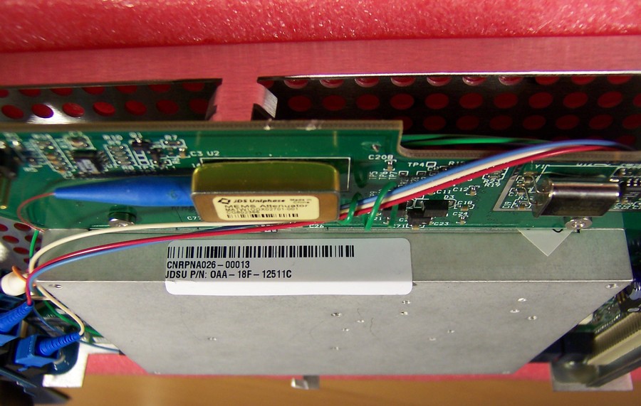 It includes one 2-stage gain-flat EDFA module with mid-stage access, JDSU P/N: OAA-18F-12511C, saturated output 18dBm, with 36-electrical pins, as shown at the last 2 photos below. See EDFA module specification including pinout info at 2nd pdf link below, so you can run this EDFA just like you drive two laser modules. It comes with 5 fibers (same as page 2 of 2nd pdf link, except that input monitor black fiber does not exist). There is also a MEMS variable attenuator MATW10DX02701-001, we believe it is paced between 2-stage amplifier.