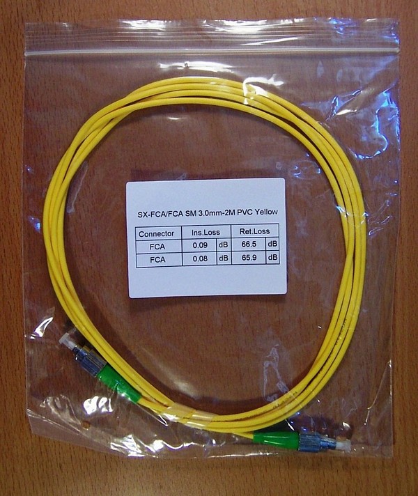 Min order qty=4. $3.28 each if buy 100pc. FC/APC-FC/APC 2-meter SM Fiber simplex jumper in 3mm cable, Corning SMF-28e fiber. Economical products. It may not match fiber connectors of other brands well. P/N:SX-FC/A-FC/A SM 3.0mm-2M PVC Yellow