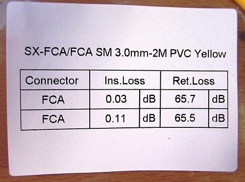 2-meter simplex 3mm cable. "OPTICAL CABLE SMF-28e SM-3.0 OFNR" is printed on the yellow cable. It uses standard Corning SMF-28e fiber which is newer version of SMF-28, better than and compatible with SMF-28. We cut many samples, and use them to easily fusion-splice with Corning SMF-28, LEAF fiber, Lucent/OFS Truewave fiber, splice loss is very low.
