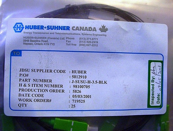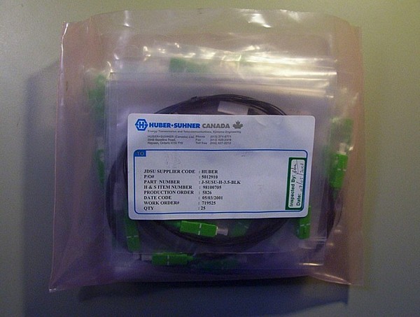 Min order qty=40. SC/APC-SC/APC 3.5-meter simplex Fiber jumper, 900um-buffered fiber. Hurber+Suhner P/N: J-SUSU-H-3.5-BLK
