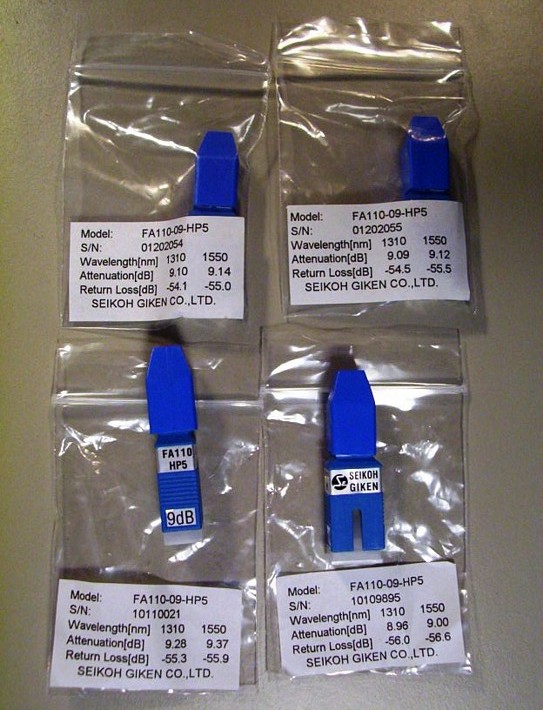 High grade PC polishing, SC/PC(UPC). Attenuation tolarance: 9dB +/-0.5dB, doped attenuator. Return loss > 50dB. It can be used with SC/PC, SC/SPC, SC/UPC connectors. male to female, SMF, work for both 1310/1550nm.