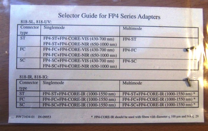 ST Connector Adaptor. You can insert FP4-ST into one side of 818-FA, and insert FP4-CORE-IR into another side of 818-FA. FP4-ST adaptor can accept any fiber jumper with ST connector.