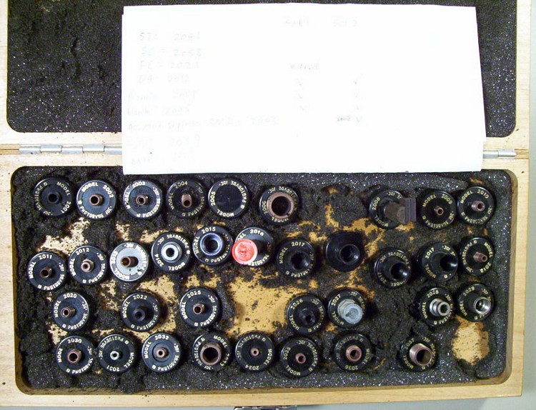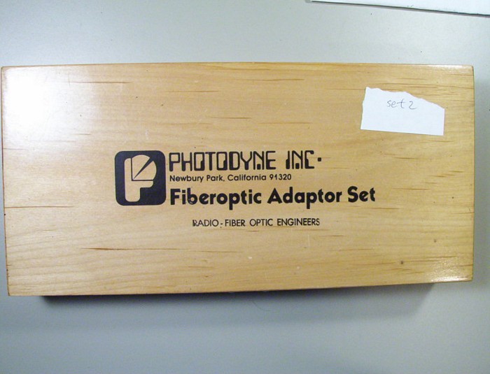 Manufactured by Photodyne Inc. of Newbury Park CA, this fiber optic adapter set features 22 different 1” diameter x 3/8” deep black plastic adapter caps numbered in the 2011-2048 series, each with 7/8” inside diameter mount threading. Each cap has a different top connector of varying diameter and material (plastic, aluminum, brass, zinc, steel), some threaded, some non-threaded. Included are three blank (no top connector) #2005 caps. The adapter caps are housed in a 13” wide x 6 1/8” deep x 1 ¾” high urethaned pine box with hinged and latching lid, and gray interior foam insulation. The bottom foam insulation is pre-cut for insertion of the adapters. The set has been used and appears to be in good overall condition, but is not complete- ten of the pre-cut adapter inserts in the bottom foam are empty. The bottom foam is showing some disintegration under the adapters from prior usage/age. The following adapters are included (with indication of top connector): #2001 (1/8” high x ¼” OD threaded plastic), #2003 (5/16” high x 6mm OD threaded brass), #2006 (7/16” high x 15mm OD threaded brass), #2008 (1 3/8” high (top ½” is ½ round) x 9mm OD non-threaded steel), #2009 (3/16” high x 4mm OD threaded brass), #2012 (1/4” high x 8mm OD threaded brass), #2017 (1/2” high x 10mm ID threaded plastic), #2018 (3/8” high x 5mm OD threaded brass), #2021 (3/16” high x 7mm OD threaded brass), #2022 (3/8” high x 7mm OD non-threaded plastic), #2026 (1/2” high x 7mm OD non-threaded plastic), #2027 (9/16” high x 8mm OD threaded zinc (RGB-style), #2031 (3/16” high x 5mm OD non-threaded brass (push/turn), #2035 (1/4” high x 5mm OD threaded brass), #2036 (1/8” high x 9mm OD threaded brass), #2039 (5/16” high x 5mm OD threaded brass), #2041 (1/2” high x 7mm OD non-threaded aluminum (push/turn), #2042 (3/16” high x 5mm OD threaded brass), #2043 (5/8” high x 10mm OD threaded brass), #2047 (3/16” high x 6mm OD non-threaded plastic), #2048 (1/2” high x 6mm OD non-threaded plastic), and an un-numbered adapter (1/2” high x 7mm OD non-threaded aluminum (push/turn). The set may be intended for adapting various fiber optic cables to Photodyne or similar format power meters.