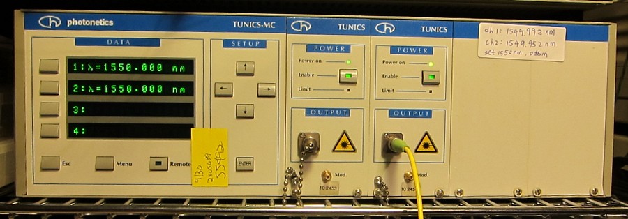 Photonetics TUNICS-MC Chassis Model 3647RA00 mainframe with two 3647HE1550-P6RL tunable laser modules. >6dBm laser tunable over 1500 - 1580 nm. FC/APC SMF optical interface. 1pm high resolution.