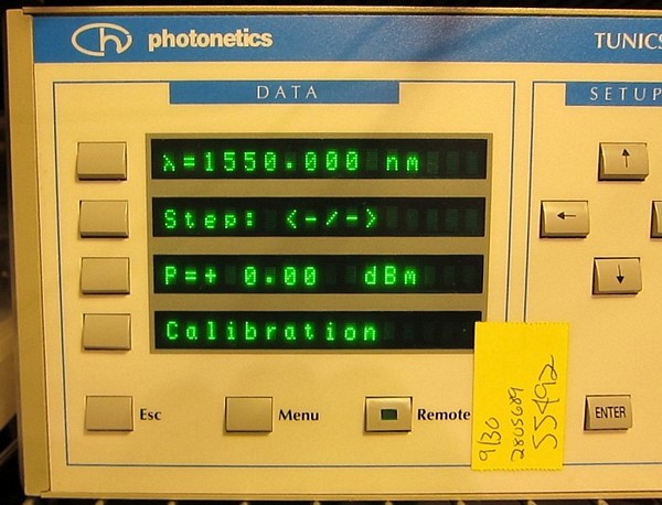 We have figured out optical interface is SMF rather than PMF. The laser can be enabled only one minute after turn on power switch. User can calibrate wavelength and output power at 1520nm and 1570nm, see photos 3-6 below (we have not made any user calibration). User can choose display one of 3 options: wavelength, f. ; P; or I, see photos 7-9.