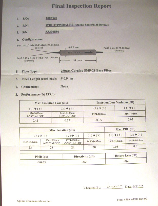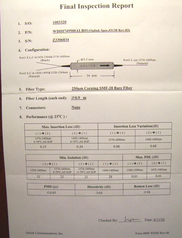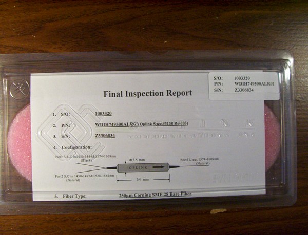 Common port 1: S+L band. Input port 2: S band, Output port 3: L band. See last photo of test sheet for detailed wavelength range. With integrated isolator from input port 1 to output port 3. Oplink P/N: WDIH749500ALR01. SMF-28 bare fiber without connectors. with original test sheet. With configuration similiar to type-B in pdf link below (for similiar model).