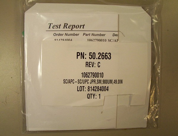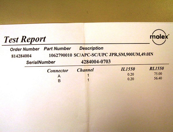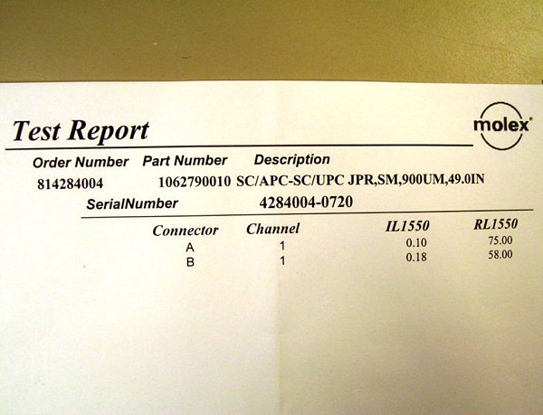 SC/APC - SC/UPC 49-inch by Molex. 900um buffer. Model: 50.2663. PN:1062790010. There are no dust caps on connectors.