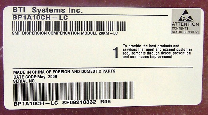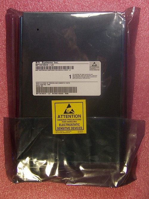 SMF20 line card, BTI model: BP1A10CH-LC. SMF Dispersion compensation module 20km-LC. It includes a C-band DCM for 20km standard SMF with 100% dispersion slope compensation, dispersion: about -340 ps/nm. OFS type: LLMicroDK: 340. with 2 LC/PC connectors