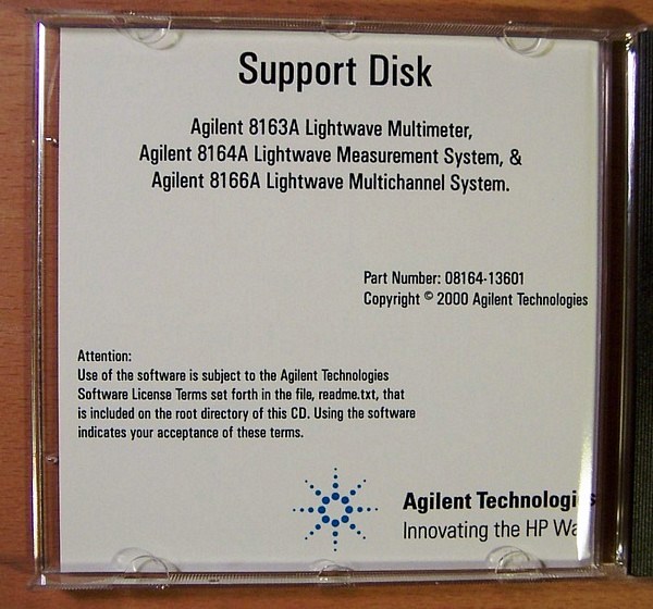 Revision E0300, March 2000. 08164-13601. This Support Disk CD-ROM contains: - Firmware Revision 2.02 for the following instruments: - Agilent 8163A Lightwave Multimeter, - Agilent 8164A Lightwave Measurement System, - Agilent 8166A Lightwave Multichannel System, and - Agilent 81640A/80A/82A Tunable Laser Modules. - The Agilent 816x VXIplug&play Instrument Driver. - All manuals for the Agilent 8163A Lightwave Multimeter, Agilent 8164A Lightwave Measurement System, Agilent 8166A Lightwave Multichannel System, Tunable Laser modules, and Power Sensor modules, Laser Source modules, Optical Heads, and Optical Head Interface modules.