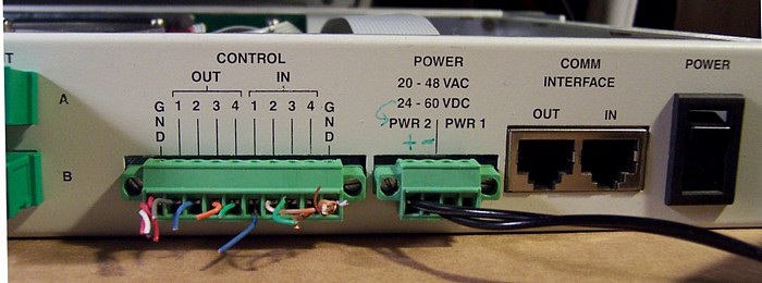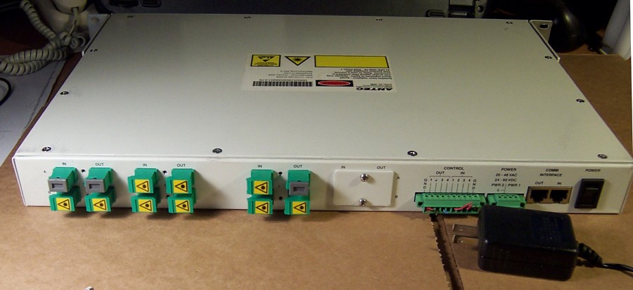 It includes three 2x2 individual switches, which can be controlled individually from front panel. There are three 2x2 Dicon prism switches inside enclosure. If choose 'A' at the front panel, switch at back panel is at bypass state. If choose 'B' at the front panel, switch at back panel is at inserted state. See 'bypass state ' and 'inserted state' diagram and general specification at 1st pdf link below. It requires 20-60VDC (<150mA) or 20-48VAC power supply. We include a non-original small wallmount AC-DC 24V power supply (see example at last photo below), which is verified working. Antec optical products were merged to Cisco systems later, see more info at last pdf link below.