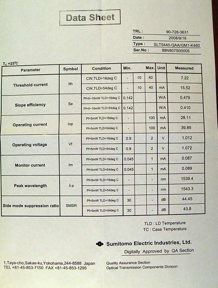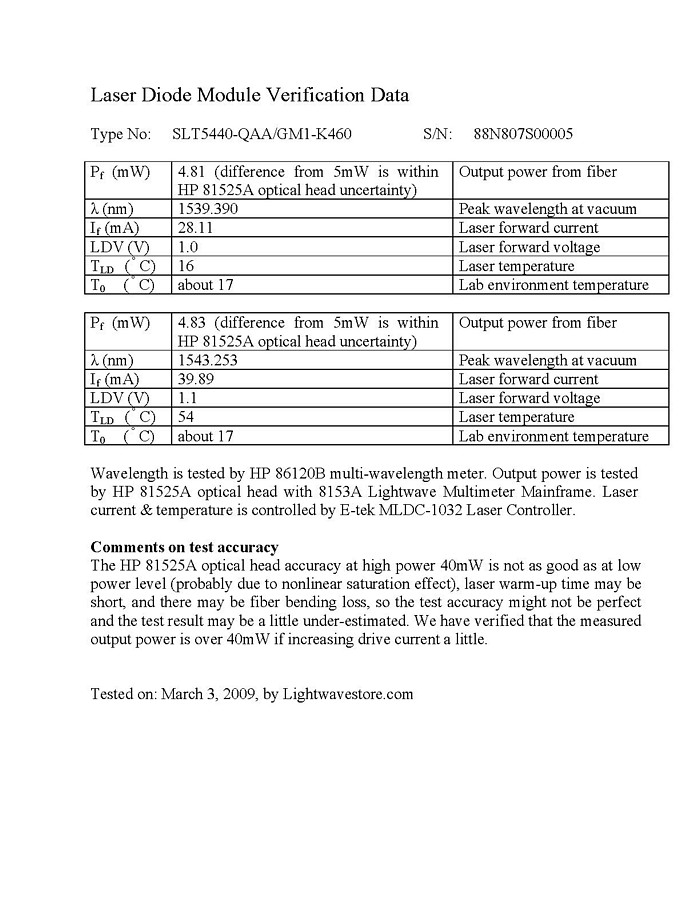 Tunable over 1539.77-1542.14nm. 14-pin butterfly DFB laser module, 5mW-average 10mW-peak. SEI  model: SLT5440-QAA/GM1-K460