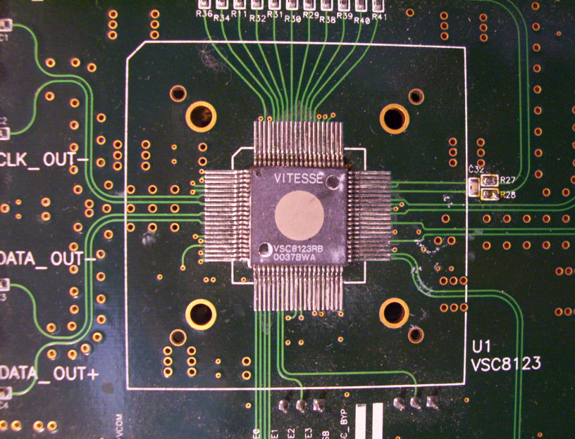 There is VSC8123RB chip soldered on th board. 10 Mb/s to 2.7 Gb/s Rate Agile, Adaptive Clock and Data Recovery